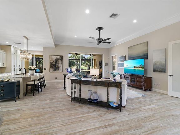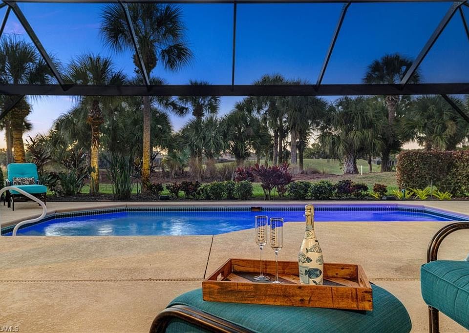 Welcome to this beautifully updated 2-bedroom plus den home, where coastal comfort meets everyday ease. Step inside and you’re greeted by an open, light-filled floor plan that feels both spacious and inviting. Soft natural tones, modern finishes, and thoughtful updates create a space that’s elegant yet relaxed, one that feels good to live in. The kitchen, dining, and living areas flow together seamlessly, perfect for quiet mornings or easy evenings with friends. Every improvement, from the high-quality finishes to the full hurricane protection, was chosen with care to bring peace of mind and lasting comfort. Step outside to a private outdoor retreat overlooking the golf course. The pool sparkles in the sun, surrounded by a large patio designed for unwinding, entertaining, or just watching the colors change over the course of the day. Set within the award-winning Miromar Lakes Beach & Golf Club, this home connects you to a vibrant, active community. Enjoy three miles of white-sand beaches, a 700-acre freshwater lake for boating and watersports, and world-class amenities including championship golf, tennis, pickleball, bocce, fitness, fine dining, and a full-service spa. This home blends warmth and sophistication with the rhythm of resort living, offering comfort, style, and a quiet sense of belonging in one of Southwest Florida’s most celebrated communities.