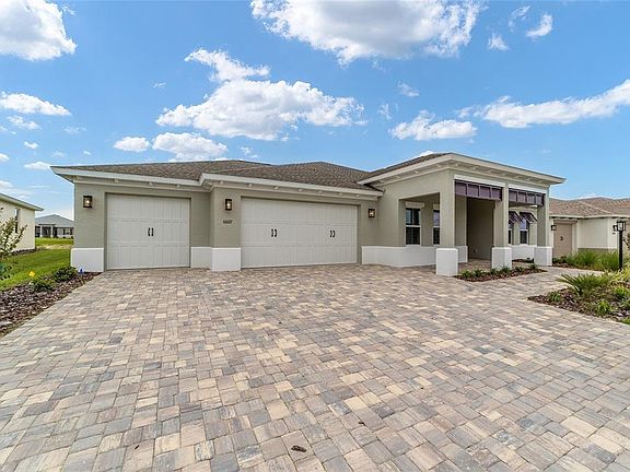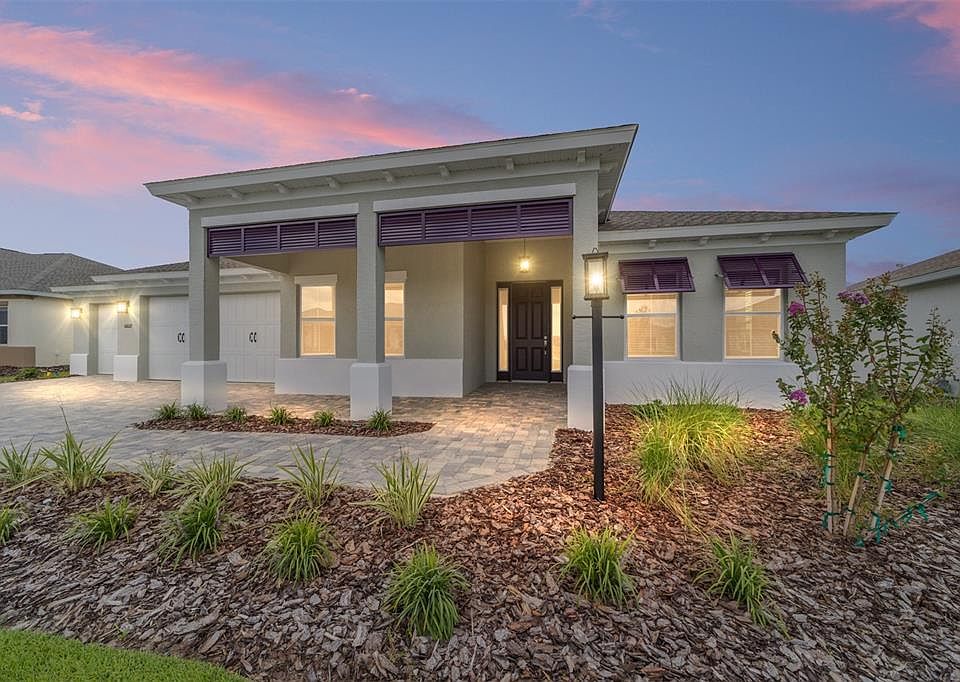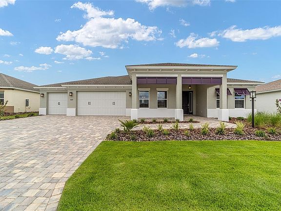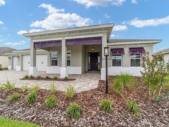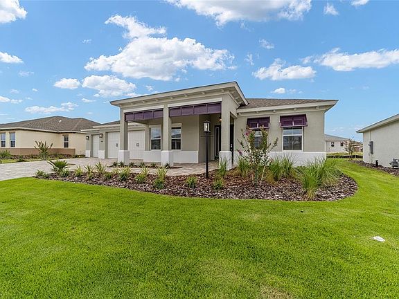 Welcome to the Arlington model, a brand-new construction home in the sought-after community of On Top of the World. Featuring 3 bedrooms, 3 bathrooms, and a 3-car garage, this residence blends elegant design with modern functionality. From the moment you arrive, you’ll notice the paver driveway and walkway, enhanced by beautiful landscaping. Inside, the home is finished with tile flooring, tray ceilings, and window blinds throughout. The open living area offers plenty of natural light and features two sets of sliding glass doors that lead to the screened lanai, perfect for indoor/outdoor living. The chef’s kitchen is beautifully appointed with staggered cabinets with crown molding, quartz countertops, backsplash, under-cabinet lighting, built-in oven and microwave, 5-burner cooktop with range hood, stainless steel refrigerator, and a walk-in pantry. The primary suite is a private retreat, showcasing a tray ceiling, a 3-panel window overlooking the backyard, and a huge walk-in closet that connects directly to the laundry room. The luxurious en suite features a double vanity sink, a zero-entry tiled shower with a built-in bench, and a linen closet. One guest bedroom also enjoys its own en suite bathroom with a single vanity sink and a tiled shower with a sliding glass door, while the third bedroom is conveniently located near the third full bath. Enjoy Florida living year-round on the covered and screened lanai. The 3-car garage provides ample room for vehicles, storage, or hobbies. Nestled within the gated community of On Top of the World, residents have access to world-class amenities including golf courses, fitness centers, swimming pools, tennis and pickleball courts, walking trails, and endless social activities. Don’t miss the opportunity to make this brand-new Arlington model your forever home! Call for your private showing today!