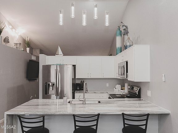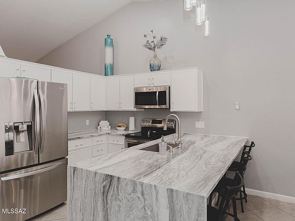 This hidden gem in Reddington Hills is range priced $295k-$305k! Soaring ceilings and flowing tile showcase the main living space which flows seamlessly into the kitchen and dining areas where you will be amazed by the waterfall edge Quartzite countertops illuminated by pendant and recessed lighting. The open concept presents dining at the breakfast bar or dining room. Relax in the spacious owners suite featuring a walk in closet and double vanity. The split floor plan includes two additional bedrooms or home office option. The fire pit and flagstone sitting area in the backyard create an inviting ambiance perfect for lounging and entertaining. Unwind at the community pool and enjoy additional community amenities. Conveniently located near Saguaro National Park, shopping, dining and more!