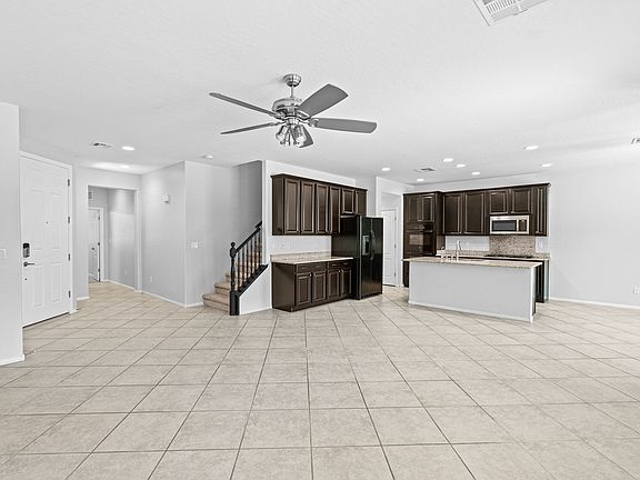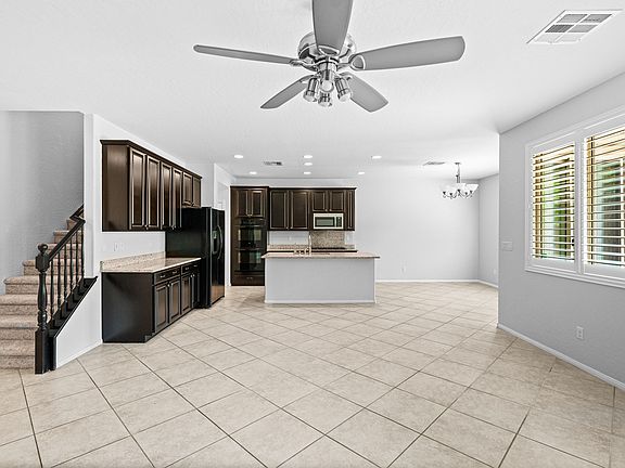 This beautifully home is located in a private gated community with its own park, just minutes from shopping, dining, and entertainment. The open floorplan features a spacious great room that flows into the upgraded kitchen & dining area with granite counters, espresso cabinets, double ovens, RO, and a large island perfect for gatherings. Home is freshly painted with new upgraded carpet and pad. Upstairs, the oversized primary suite includes a private balcony and oversized walk-in closet, two additional bedrooms share a Jack-and-Jill bath, with one serving as a large secondary suite complete with its own walk-in closet and the downstairs bedroom with full bath is ideal for guests or as an office. Modern conveniences include a Tesla charger, smart keyless entry, wired security setup, plantation shutters, ceiling fans throughout, front-load washer & dryer, water softener, and epoxy-finished garage. Step outside to a professionally landscaped backyard with fruit trees, a covered patio, and an electric retractable awning for year-round enjoyment.