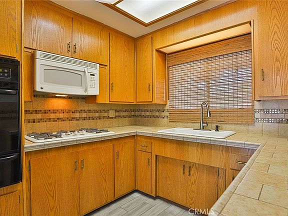 The open kitchen includes tile countertops and backsplash, ample cabinetry, built-in range, oven, and microwave is waiting for its next culinary enthusiast. Adjacent to the kitchen is the family dining area, which seamlessly flows into the family room. A large sliding door opens to your expansive garden oasis, perfect for indoor-outdoor living.