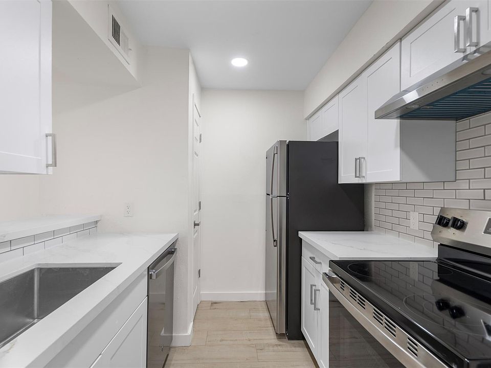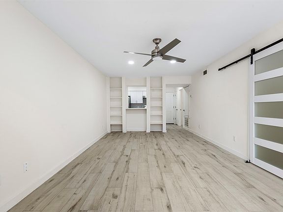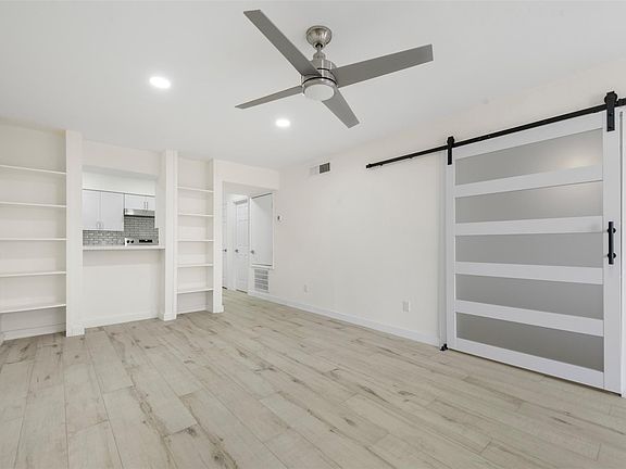 Fully renovated 1 bedroom, 1 bath condo in a gated community at 10075 Westpark, Houston, TX 77042. This 690 sq ft first-floor unit features BRAND NEW HVAC, flooring, quartz countertops, stainless steel appliances, and a new stackable washer/dryer. Enjoy a private concrete back patio, garden-ready bed, and storage closet. The kitchen offers a modern subway tile backsplash and sleek white cabinetry. Open living area includes built-in shelving and recessed lighting. A sliding barn door separates the living space from the bedroom, adding a modern touch. The bathroom features updated finishes to match the home’s clean aesthetic. Natural light fills the unit through large sliding glass doors, creating a bright, airy feel. This quiet, well-kept gated community includes a refreshing pool and guest parking. Centrally located with access to Beltway 8 and Westpark Tollway, you're minutes from shopping, dining, and major employers. A turnkey deal for first-time buyers, downsizers, or investors!