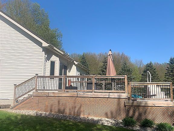 House is 2270 sq ft basement has additional 1370 sq feet and 1260 finished sq ft. Of it is finished. 5 possible 6 bedroom home, 3 car garage plus 24x32 extra garage, both garages are heated. Anderson windows, newer furnace, newer hot water tank. Two tier deck above ground pool with deep end, new liner, pump, filter. Large deer blind behind extra garage, hunt at home. All sitting on just shy of 2 acres, with lots of surrounding woods for seclusion. contact me for more info