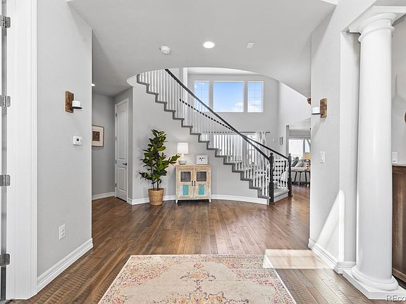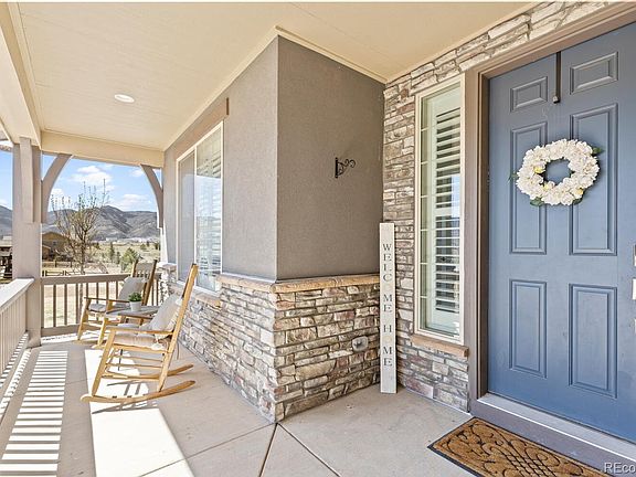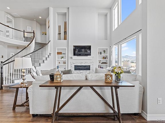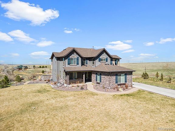 Stunning cul-de-sac home on a premium 2.3 acre lot with expansive mountain views, backing to the Highline Canal! When you first walk into this home you'll notice the soaring cathedral ceilings, abundant natural light, open floor plan and beautiful hardwood floors.  The kitchen and adjacent two-story great room are the heart of the home and ready for entertaining guests around the large granite island and fireplace.  There are two walk-in pantries with ample storage and an entertainers' bar conveniently located between the dining room and kitchen.  An office with mountain views and a formal dining room, with easy access to the kitchen, are right around the corner. A main floor bedroom, with en suite bath and walk-in closet, is thoughtfully tucked away from the rest of the main floor. The grand staircase directs you upstairs to the primary bedroom with en suite 5-piece spa bathroom and a spacious walk-in closet.  Convenient upstairs laundry is nearby, as well as a flex room with double french doors that can be used as an extra office, game room or even 5th bedroom. Two additional bedrooms, each with a walk-in closet, share a full bathroom and complete the upstairs.  The large unfinished basement provides a blank slate to create any space desired! Wander outside to the extended patio to enjoy breathtaking sunsets while warming yourself by the 10 foot long fire pit or while sitting in the hot tub. A beautifully landscaped yard with huge mountain views stretches around the home and is ready for games of all kinds.  A generously sized 4-car garage with an exterior entry door is perfect for a car lover or to hold all the toys. This home sits on a prime location a short drive to the city and surrounded by miles of trails on the Highline Canal and in Roxborough, Deer Creek Canyon and Chatfield Reservoir.  You do not want to miss this rare opportunity in The Estates at Chatfield Farms!