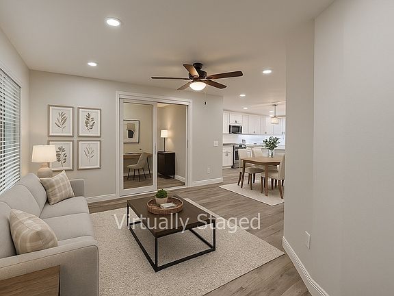 Modern vanityCozy electric fireplaceStainless-steel appliancesOpen dining spaceQuartz countertopsModern kitchenFully fenced backyard
