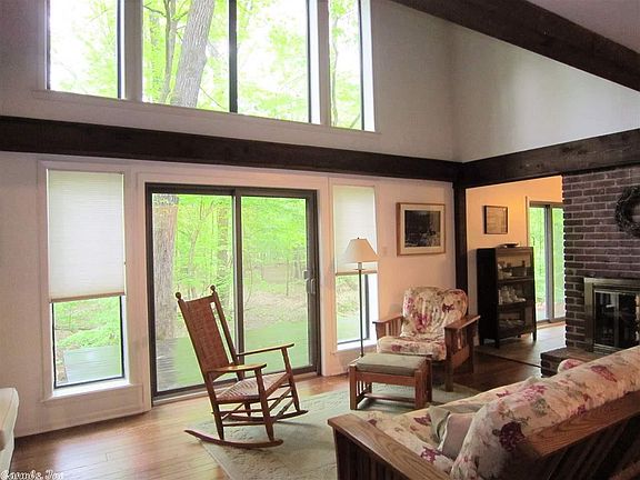 Unique home and gorgeous setting on 3.34 acres(mol). Master bedroom and bath downstairs, add'l bedroom and sitting area upstairs, could be converted to 3rd bedroom. Upstairs balcony overlooks living room with beautiful rows of windows and beamed wood ceiling. Living room with double sided fp into the kitchen with open cabinets, & porcelain tile flooring. New windows & doors since 2007. Mudroom & workshop. Back deck overlooks a stunning natural view. Acreage amount taken from most recent survey 7/6/2018.