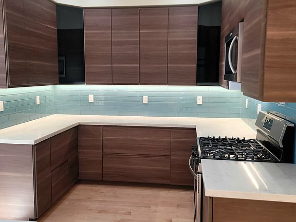 High ceilingsWhite quartz countertopsOpen floor planAbundance of lightSparkling stainless steel appliancesVibrant blue tile backsplashClean white walls