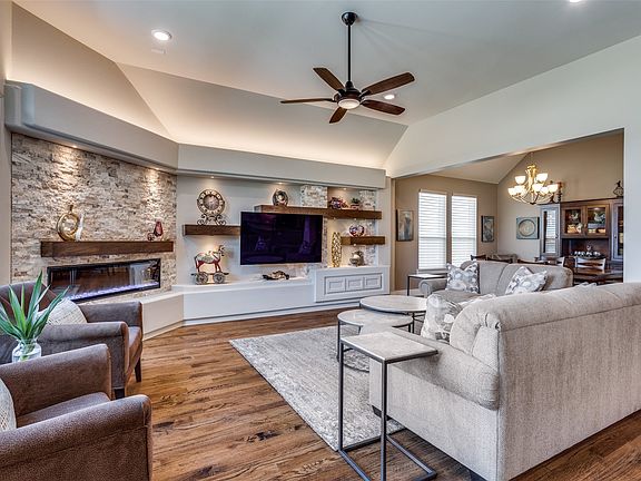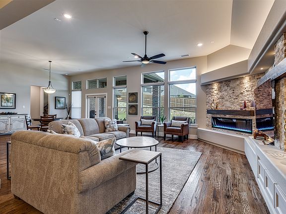 A home of this quality and customization can’t be built for this price! Lived in less than a year, this stunning Shaddock Home has been thoughtfully customized with over $130,000 in upgrades, offering the perfect blend of luxury and livability. Real hand-scraped hardwood floors and elegant leathered Taj Mahal quartzite surfaces set the tone for timeless sophistication. The kitchen is a true centerpiece, featuring an oversized island with seating for four, an induction cooktop, beautiful pendant lighting, and soft-close drawers, along with abundant storage. The spacious living room showcases a custom media wall with an electric fireplace, floating shelves, and striking ledger stone detail, creating a refined focal point for the home. Versatile by design, the large office can double as a den to suit your lifestyle needs. The extended primary suite is a private retreat with a cathedral beamed ceiling and plantation shutters. The primary bath offers a rain glass shower surround, separate vanities, medicine cabinets, a garden tub, and a separate shower. The custom walk-in closet has been designed for maximum organization with large storage cabinets, built-in drawers, and ample shelving. Further enhancements include upgraded light fixtures, ceiling fans and custom mirrors throughout. Outdoor living is just as impressive, with a covered patio, extended entertaining space, and a beautifully landscaped yard featuring boulder bordered flower beds, walking paths, a storage shed, and 12 French drains for superior yard drainage. The 3 car tandem garage is the perfect space for parking, hobbies or more storage. Located in the master-planned community of Inspiration, residents enjoy access to pools, pickleball courts, playgrounds, a dog park, greenbelts, a clubhouse, a fitness center, and hiking trails around Lake Lavon. This executive turn-key home has been meticulously planned and upgraded in every detail. Schedule your appointment today to view this special home.