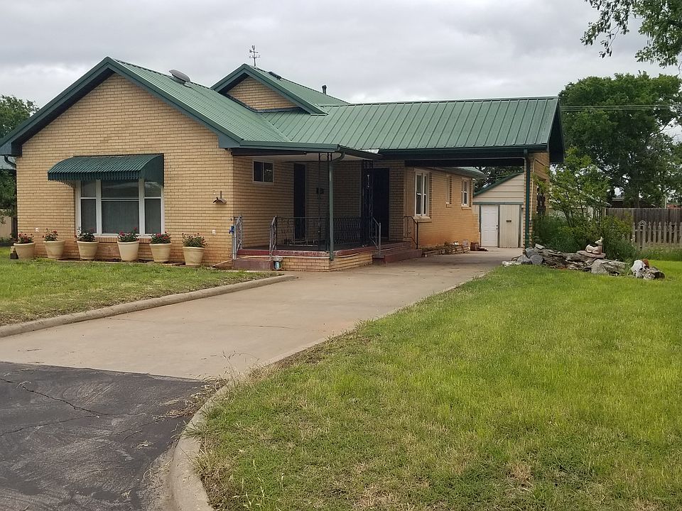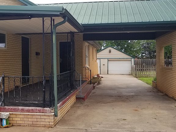 This 3 bedroom/1 & 3/4 bath home is a beautiful, historic home with gleaming oak floors throughout the house with the exception of the kitchen and bath. It is economically efficient with new windows/doors, extra insulation, thermostatically controlled roof vents, ceiling fans, tankless water heater, newer H/AC, and a metal roof. The kitchen has oak cabinets, gas stove, dishwasher, refrigerator, breakfast bar, and new sink/faucet. The utility room has lots of storage, washer/dryer hookups, and a door to the back yard. The basement has storage, a 3/4 bath and a storm shelter. The front porch is covered and has wrought iron railing. The driveway leads to a covered breezeway to the porch and on to the garage. There is also a covered carport and storage shed on the other side of the house. There is a small fenced-in yard and a huge open yard with exterior fencing. There is a nice garden space also. Home warranty! This is a great home in a nice neighborhood...don't let it slide by!