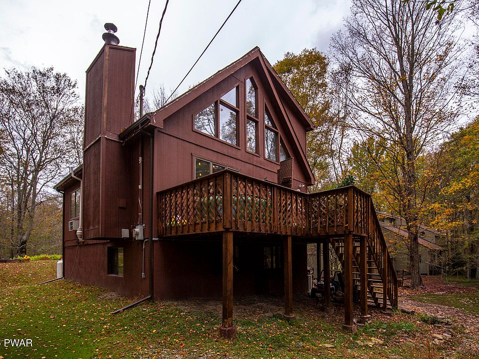 Nestled in a peaceful community surrounded by nature, this 4-bedroom, 2-bathroom chalet offers the perfect blend of comfort, privacy, and recreation. Set on a quiet, private lot that backs directly to state game lands, you'll enjoy unmatched rear privacy and the serenity of a wooded backdrop. The home's warm and inviting design features an open-concept living area with rustic charm, soaring ceilings, and large windows that fill the space with natural light. This home has 3 types of heat proprane, woodstove and pellet with ductless mini splits installed just last year. Step outside and take in the fresh mountain air from your spacious deck, ideal for relaxing or entertaining.Located in the Pocono Springs community which offers a private lake, swimming pool, and a variety of recreational amenities, this property provides year-round enjoyment for outdoor lovers and families alike. Whether you're looking for a full-time residence or a weekend getaway this chalet delivers the perfect mix of seclusion, comfort, and access to community life.