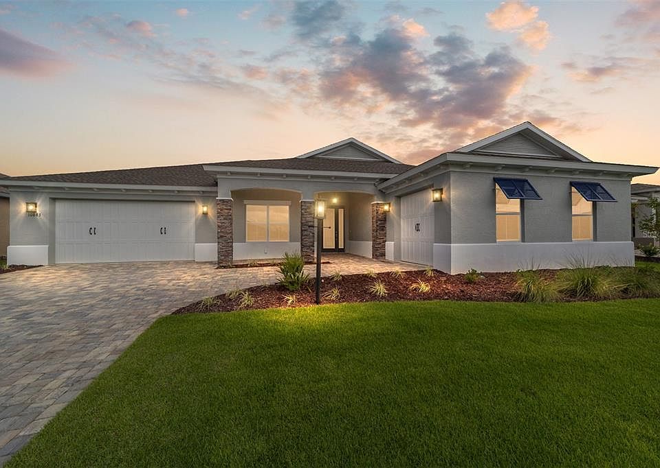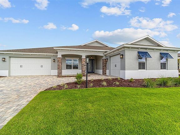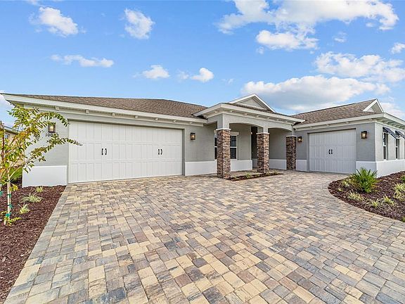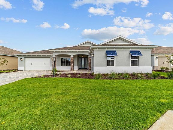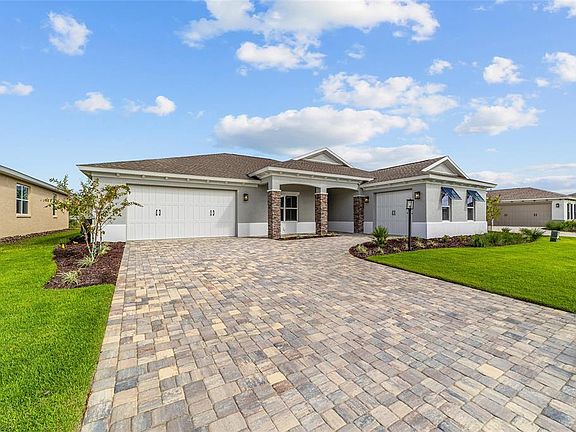 Stunning Dunbar Model in Balfour at On Top of the World! This exquisite new construction home offers 3 bedrooms, 3 bathrooms, over 2,300 sq. ft. of living space, and a split 3-car garage. The home is enhanced by a paver driveway and walkway with lush landscaping, creating a welcoming entrance. Inside, the open floor plan with tray ceilings creates a bright and spacious living area. Entertain effortlessly with a gourmet kitchen featuring premium white staggered cabinets with crown molding, under-cabinet lighting, a walk-in pantry, built-in oven and microwave, and a 5-burner cooktop with range hood. A separate wet bar with wine cooler adds a touch of luxury. 4-panel sliding doors lead to a screened lanai, perfect for enjoying Florida’s beautiful weather. Located in the highly desirable Balfour neighborhood within Ocala’s premier 55+ community, On Top of the World, this Dunbar Model blends modern design, elegance, and functional living in every detail. Call for your private showing today!