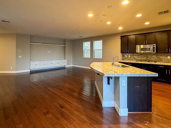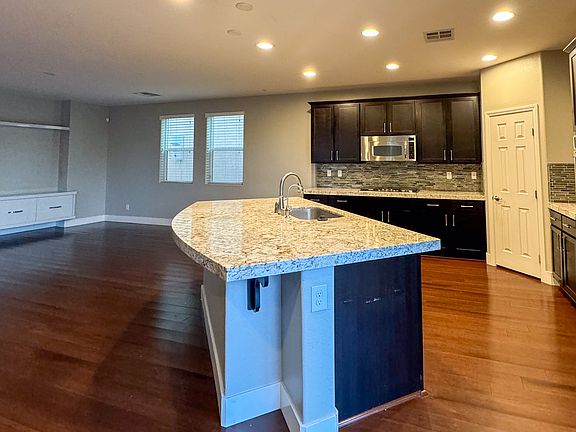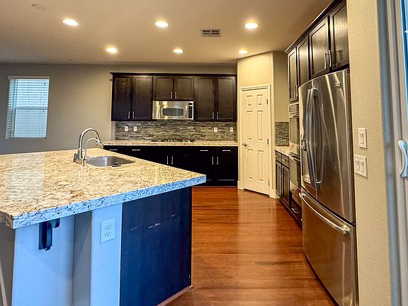 This 4-bedroom, 2.5-bath home features an upstairs loft, bamboo flooring on the main level, and a kitchen with granite countertops, double ovens, 5-burner cooktop, and French door refrigerator. Includes soft-close cabinets, glass tile backsplash, and built-in environment center. Upstairs offers a primary suite with double sinks and walk-in closet, plus a laundry room. Additional features: 5.1 surround sound prewire, reverse osmosis, and whole-home water filtration system.