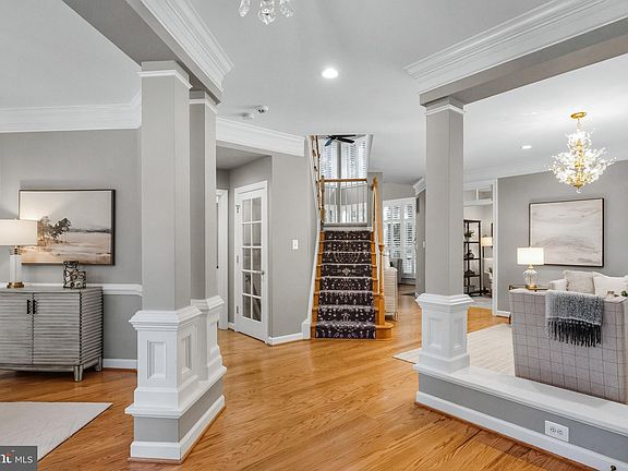 One of the community’s most desirable floor plans, this elegant three-side brick Parkhurst model is sited in the heart of Fairfax City’s prestigious Farrcroft neighborhood, an award-winning, partially gated enclave celebrated for its blend of historic charm and modern sophistication. The welcoming front portico opens to a gracious foyer, embraced by formal living and dining rooms, each appointed with oversized floor-to-ceiling windows, plantation shutters, substantial crown molding, and refined columned entries. The fully remodeled gourmet kitchen showcases painted cherry cabinetry, granite countertops, a travertine-style backsplash, and a center island with breakfast bar seating. Professional-grade appliances include a 48” GE refrigerator and microwave, Thermador gas cooktop, cabinet-paneled Bosch dishwasher, and double wall ovens. The adjacent breakfast room, with custom glass-paneled cabinetry, opens to a striking two-story family room. With 19-foot ceilings, a gas fireplace, built-ins, and a wall of windows, the family room is flooded with natural light. French doors from the living room lead to a private office or library. A custom mudroom with built-in cubbies, a separate laundry room, and a powder room complete the main level. A graceful switchback staircase ascends to a generous upper landing and loft area, an inviting space ideal as a reading nook, study, or casual lounge, overlooking the family room below. The spacious primary suite offers a tray ceiling, plantation shutters, a sitting alcove, and two walk-in closets. The fully remodeled primary bath evokes timeless elegance with travertine tile, a cherry double vanity topped with honed marble, a vessel soaking tub, frameless glass shower with built-in bench, and a private water closet. Bedroom 2 serves as a secondary suite, featuring a walk-in closet, plantation shutters, and a private en-suite bath with newer marble-style flooring and a sleek white marble-style countertop. Bedroom 3, also with a walk-in closet, and Bedroom 4 share an equally refined hall bath, appointed with updated fixtures, marble-style tile flooring, and tasteful finishes that complement the home’s cohesive design aesthetic. The finished lower level provides an exceptional entertaining space, including a recreation area, game room with walk-up access to the rear patio, and a full bar with cherry cabinetry, granite countertops, beverage refrigerator, and sink. A powder room and large utility/storage room complete the level, offering ample flexibility for future expansion. Outdoors, the fully fenced, low-maintenance yard features an expansive paver patio extending the full width of the home, perfect for alfresco dining and gatherings. Celebrated as one of Fairfax City's most sought-after neighborhoods, Farrcroft captivates with its tree-lined streets, timeless colonial architecture, and serene park-like setting. Residents enjoy exclusive access to walking trails, tranquil ponds, a historic clubhouse, a swimming pool, and a playground. Ideally located within walking distance to downtown Fairfax, the home offers easy access to a vibrant mix of restaurants, shops, and entertainment. Seasonal events, including the popular "Rock-the-Block" concerts, add to the year-round charm, making this residence a perfect haven for those seeking both community and sophistication.