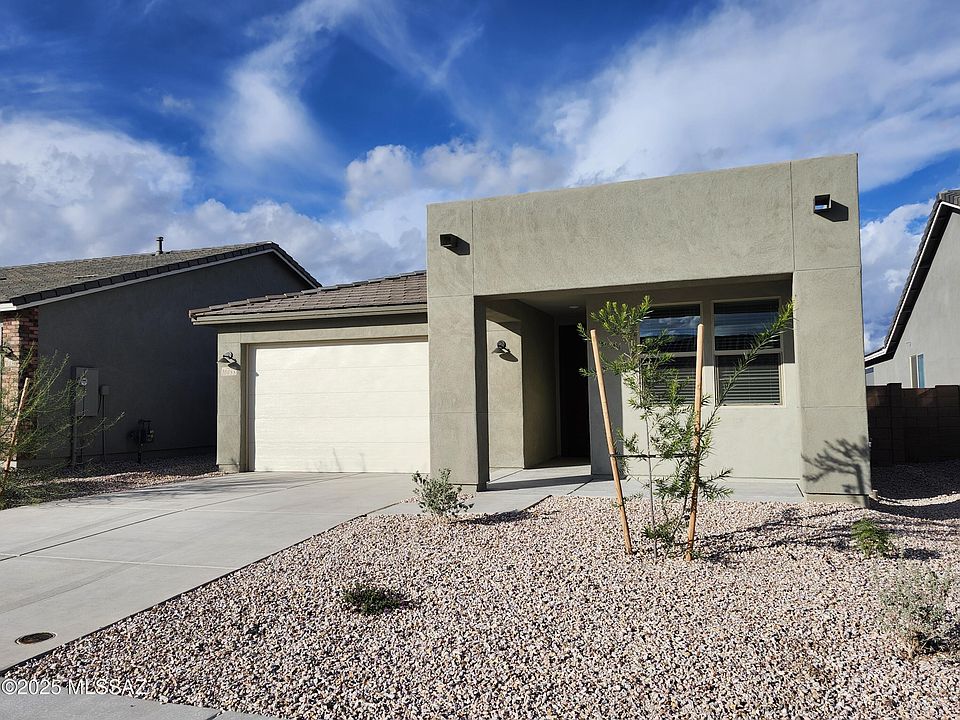 Brand new Mattamy Homes Copper Plan w/Desert Modern elevation! This thoughtfully designed home features an open great room layout w/spacious dining area & contemporary kitchen. Offering 3 bedrooms, 2 full baths & enclosed study/den--ideal for a home office, study space, or private retreat. Primary suite is a true escape, featuring a generously sized walk-in closet, walk-in shower, dual-sink vanity, & a peaceful view of the backyard. The kitchen includes gas range, refrigerator, center island, & walk-in pantry--perfect for cooking/entertaining. Additional highlights include W&D, faux wood blinds, 8 ft. doors, neutral color palette, covered patio, low-maintenance rock landscaping, & tankless water heater.The garage includes a 240V outlet, ideal for electric vehicle charging. Vail Schools.
