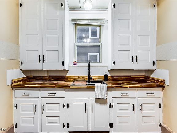 Detached garageLarge front porchDouble glass doorsMain bathWhite cabinetryWooden countertopsDining area