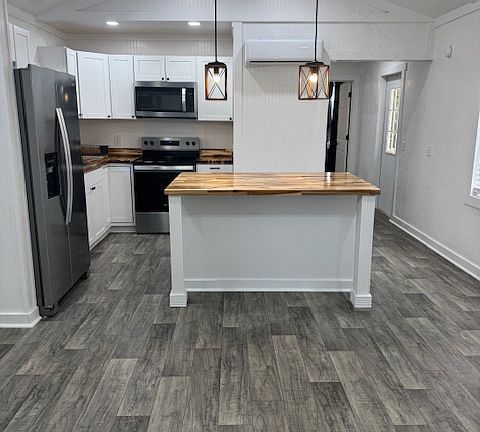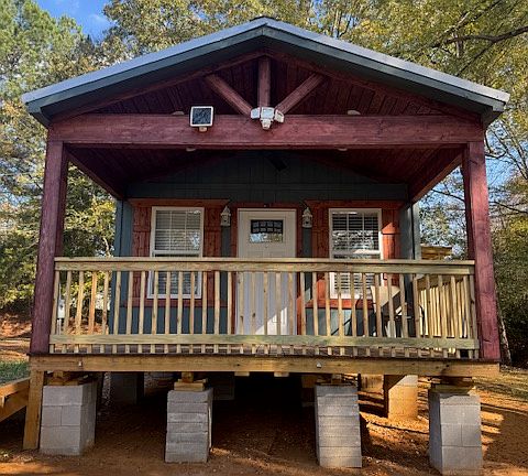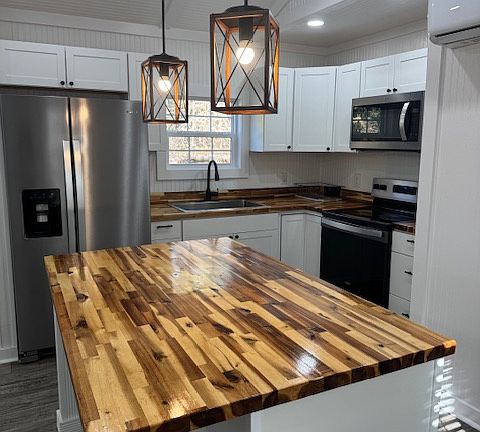 This charming 1-bedroom, 1-bath tiny home is move-in ready and packed with thoughtful features. The kitchen offers generous cabinet storage, stainless steel appliances, and a spacious butcher-block island perfect for meal prep or casual dining. The large bathroom includes a walk-in shower and modern finishes. A washer and dryer are provided, and lawn maintenance is included in the rental price, making this an easy, low-maintenance living option.