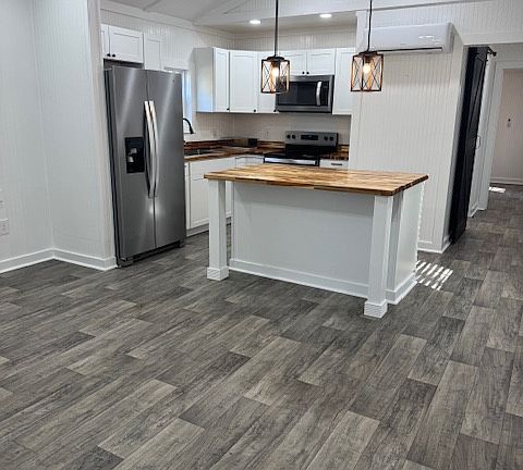 Spacious butcher-block islandModern finishesGenerous cabinet storageStainless steel appliancesWalk-in shower