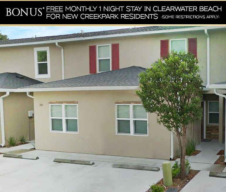 EXCLUSIVE DEAL-*Any new renter of Creek Park Homes will automatically be offered a one-night stay at Devon Shores or Ivory Sands in Clearwater Beach Florida. Offer is only valid for a one night stay every month when you sign a 12-month lease. Offer expires at the end of every month and cannot be carried over into the next month or combined with any other month. Offer is dependent on availability - please inquire with property manager.