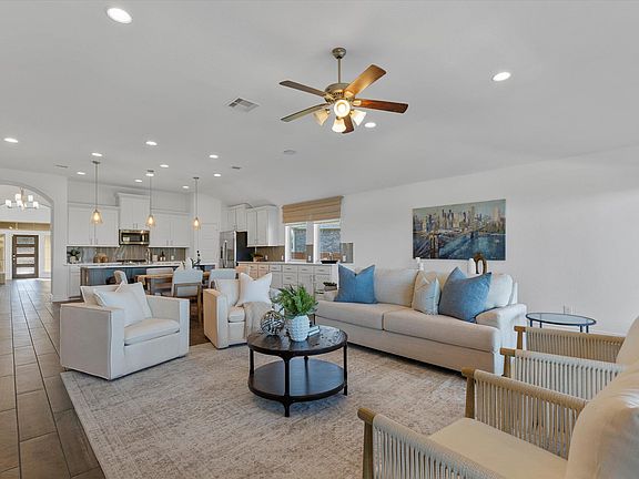 - Description: The stunning open floor plan living room is lined with tall windows that frame views of the tree filled greenbelt behind the homes and infuse the home in natural light; Easy maintenance wood-look tile flooring runs throughout the main living area