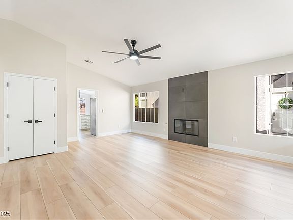 An exceptional opportunity to acquire a recently renovated residence boasting contemporary design and a light-filled open-concept layout. The exterior features traditional stucco and brick accents with a classic tile roof and low-maintenance xeriscaping. The main living area showcases elegant light wood-look tile flooring throughout and vaulted ceilings, enhancing the sense of space. A striking focal point is the modern fireplace, set against a sleek, dark-gray tiled accent wall. The room is further appointed with a modern ceiling fan and crisp white trim and doors. Both bathrooms have been tastefully updated. The primary bath offers a spa-like experience with a dual-sink vanity, quartz countertop, black hardware, and an illuminated LED mirror. The secondary bath maintains the contemporary aesthetic with a new vanity, modern fixtures, and a subway-tiled tub/shower combo. This move-in-ready home offers a sophisticated, modern lifestyle and is impeccably maintained.