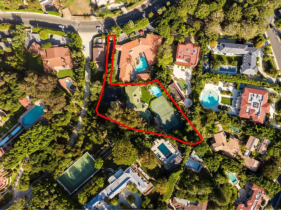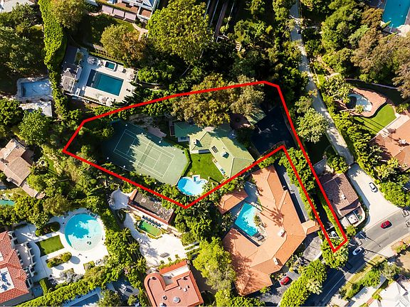 Prestigious redevelopment estate or owner user opportunity. Located down a long private driveway and once part of the original William Randolph Hearst Estate, this tennis court property lies on over a 3/4 of an acre lot and set privately behind gates! This home was originally 4 bed/5 bath but was remodeled to 2 bed/3 bath to offer a grand primary suite complete with vaulted ceilings, fireplace, spacious walk-in closet, and luxurious en-suite. The manicured grounds feature a rosegarden, fruit and vegetable trees, in-ground pool and spa, cave alcove, and full size tennis court with lights - all surrounded by mature landscaping. Seamlessly blending indoor-outdoor living, nearly each room is framed by floor to ceiling windows allowing for maximum natural lighting throughout. This open concept retreat includes a formal dining room, living room with a bar, custom chef's kitchen, laundry room, and guest suite. Ideally located just North of Sunset in Beverly Hills, a few blocks from the Beverly Hills Hotel.