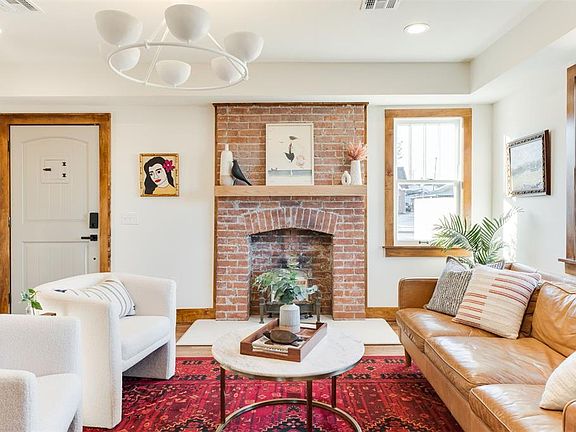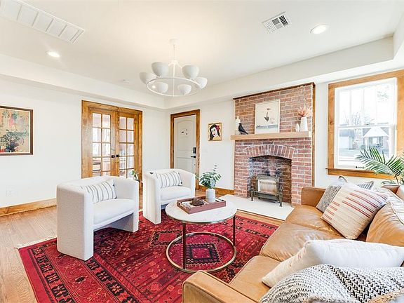 Impeccably crafted restoration with a unique and thoughtfully functional floor plan! This show stopping home has been lovingly reimagined, creating a warm and inviting ambiance. French doors lead into a dedicated office space adorned with wainscoting and painted a perfectly moody pink. The airy living room is embellished with a lovely brick fireplace, stained woodwork, and tray ceilings. Through a large archway, the kitchen and dining room are enhanced by soaring vaulted ceilings. The kitchen features custom built white oak cabinetry, quartz and soapstone countertops, and ample storage space. Two spacious bedrooms are each equipped with a built in desk and private en-suite. This gem is a rare find!