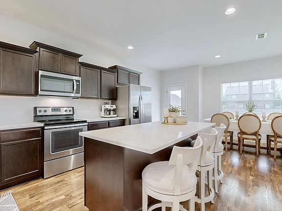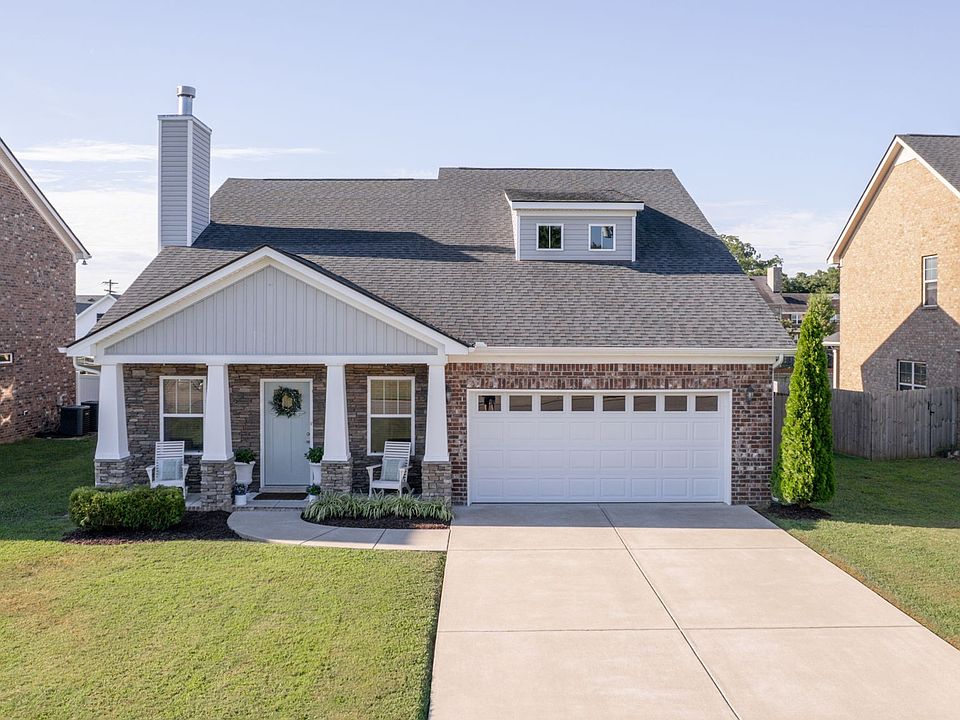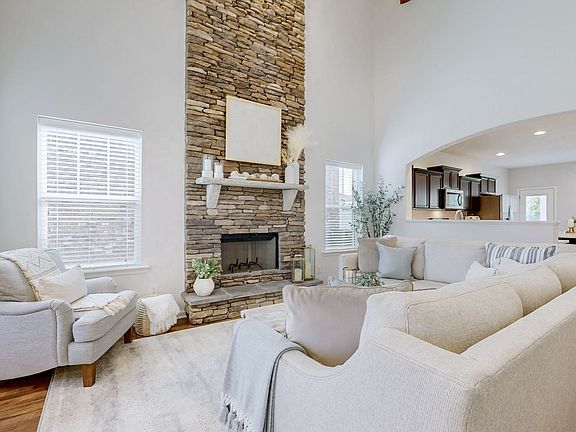 Beautiful brick 3 bedroom home with 2 full baths and 2 half baths located in a sought-after neighborhood with no HOA and no city taxes! From the moment you step onto the charming covered front porch, you'll feel the warmth and quality this home offers. Inside, an inviting open floor plan welcomes you with soaring vaulted ceilings in the living room and a dramatic 15’ stone fireplace that has never been used. The kitchen features sleek quartz countertops and a large island, ideal for everyday living and entertaining.