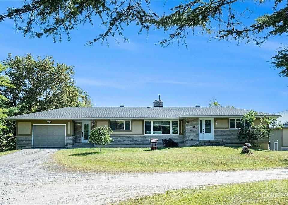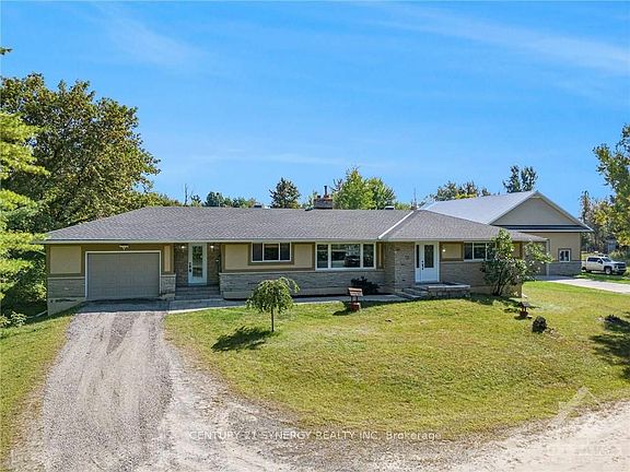 Welcome to this charming 3-bed, 2-bath detached bungalow on a spacious lot with endless possibilities! Featuring two driveway entrances and a lovely pond, you'll follow the interlock walkway to either the front door or the enclosed breezeway. Inside, the main floor has an open kitchen with granite countertops, a dining room, and a cozy living room with a wood-burning fireplace. The primary and second bedrooms, along with the main bathroom, are located on one side, while the third bedroom and an additional bathroom are on the opposite side for added privacy. The basement includes a comfortably sized bedroom, laundry room, and extra open space for your needs. The large backyard, complete with a deck and pergola, is perfect for relaxing or entertaining. A standout feature is the incredible 40x60 insulated workshop, offering plenty of space for hobbies, and an upstairs office that opens to a large balcony overlooking the backyard. Located close to all of Kemptville's amenities.