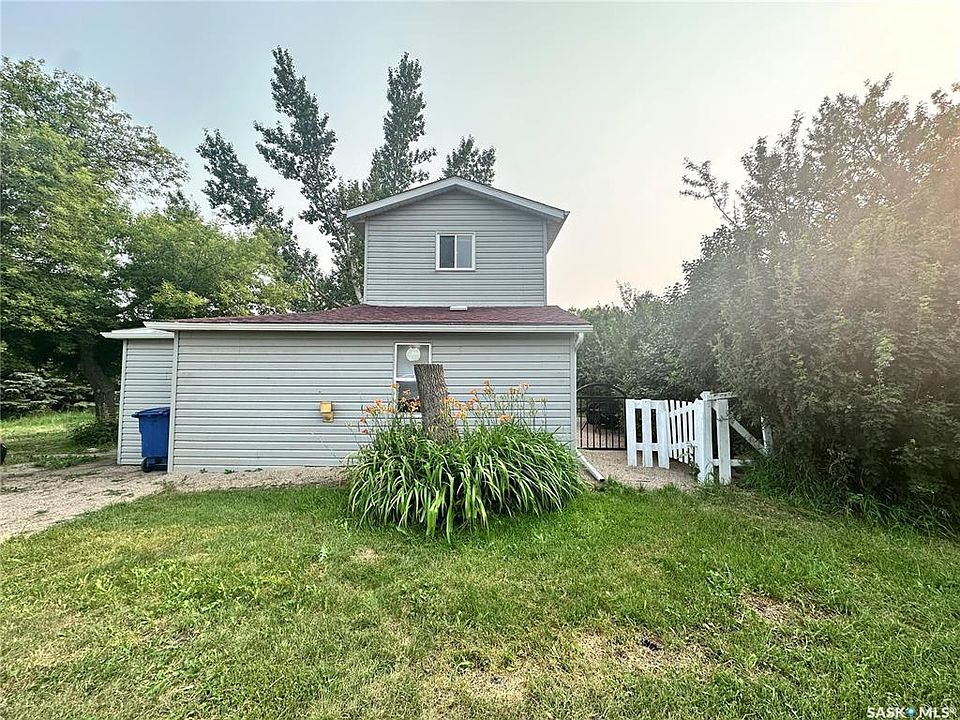 Welcome to your peaceful getaway in the quiet community of Davin, perfectly situated at the end of a tranquil street and only a short 30-minute drive from Regina. This delightful 1 1/2 storey home offers the perfect balance of countryside charm and modern convenience. Step inside to discover a warm, inviting atmosphere. The main floor features an accessible bedroom, ideal for guests or those seeking one-level living, while the upper loft-style bedroom offers a private and cozy retreat. The bathroom is cleverly designed to include in-suite laundry, adding to the home's practical layout. An open-concept kitchen and living area create a bright and spacious main living space. A stylish dividing wall adds character while preserving an open flow between rooms. Outside, enjoy a large yard that backs onto a serene treed area—perfect for relaxing evenings, family gatherings, or outdoor entertaining. A garden space is already in place, with plenty of room for your personal touches to create the ultimate outdoor oasis. Additional features include a single detached garage—ideal for parking, storage, or even converting into a studio or workshop. Recent Updates & Improvements: Main floor structurally braced, Upper floor lifted with added rafters, Lower roof replaced with new shingles, New drywall and fresh paint throughout, Replaced water main shutoff, Driveway widened to accommodate two vehicles, Patio gated and fully fenced, New kitchen counters, New living room heater, Don’t miss this opportunity to own a unique, move-in ready home that offers peace, privacy, and potential—all within easy reach of the city. Come see everything this lovely property has to offer!