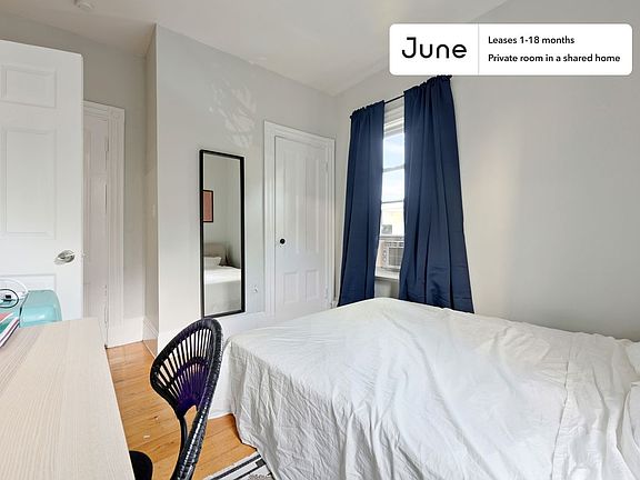 This Queen room in Mission Hill is available on a 12 month lease or a flexible short term (31 to 364 days) lease. You pick your custom start and end date. Monthly rent rate is determined by furnishing preference, move-in date and move-out date. Speak to a June representative for recommendations on the best stay duration for the lowest rate.