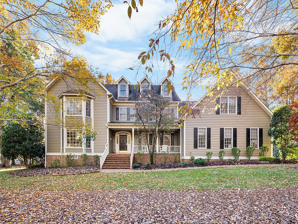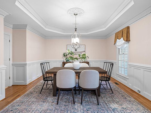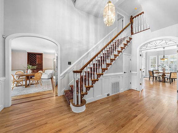 Welcome Home to Treyburn. This stately residence blends timeless architecture with modern luxury. Step through the freshly painted entryway into a stunning three-story foyer, featuring three graceful archways that lead to the bar room, dining room, and kitchen. Beveled glass doors allow for privacy while maintaining a sense of openness and flow. The foyer includes a convenient half bath, while new hardwood floors in the kitchen and entry complement refinished hardwoods in the dining and family rooms, all enhanced by crown molding and fine millwork throughout. The dining room off the kitchen features a tray ceiling with elegant crown molding, creating the perfect setting for holidays and dinner parties. The sunroom, with windows on three sides, motorized skylights, and a cozy fireplace, is the ideal spot for coffee at sunrise or holiday mornings spent by the fire. The chef's kitchen is a showstopper: 5-burner Viking stove with downdraft, double blue-enamel ovens, granite countertops & stone backsplash, a massive island with generous storage, built-in coffee bar with capsule disposal drawer (and custom Latte-inspired cabinet knobs), double sink with Insta-Hot. A modern laundry room features recycled-material counters, pull-out hanging racks, and ample cabinetry. Two hall coat closets front and back add convenience and organization. A private main-floor guest suite includes a large closet, and a walk-in shower with seat and grab bars, offering both comfort and accessibility for visitors or multi-generational living. The primary suite is a true retreat with freshly painted walls and an elegant updated bath featuring a double-nozzle shower, whirlpool tub, and private water closet. Two custom-designed closets include drawers, shelving, hamper space, and pull-out rods for effortless mornings. Two additional bedrooms share a Jack-and-Jill bath, while a fourth bedroom or study offers a wall-mounted TV with hidden wiring and a wall of solid cherry bookcases, perfect for a library or office. At the end of the hall, a back staircase leads to a carpeted bonus space and an adjoining playroom or exercise room. A room-length cedar closet provides organized storage, shelving, and a blackboard wall for notes or workout goals. The third floor offers over 900 sq. ft. of finished space with a full bath and skylights. Perfect for a nanny suite, teen retreat, or multiple home offices, this level includes plush carpeting, abundant natural light, a long window seat, and a walk-in storage room that could easily be converted to a closet. The spacious three-car vaulted garage features solid wood garage doors and a brand-new epoxy floor with a lifetime warranty, the perfect blend of beauty and durability. Enjoy a new wooden deck designed for lounging and dining, with built-in seating and a brick grilling area for effortless entertaining. Professional landscaping with irrigation surrounds the home, accented by a welcoming trellis by the garage for timeless curb appeal. With over 5,600 sq. ft. of refined living space, thoughtful updates, and luxury finishes on every level, this home offers the ultimate combination of elegance, comfort, and functionality. A true showcase of gracious living - inside and out.
