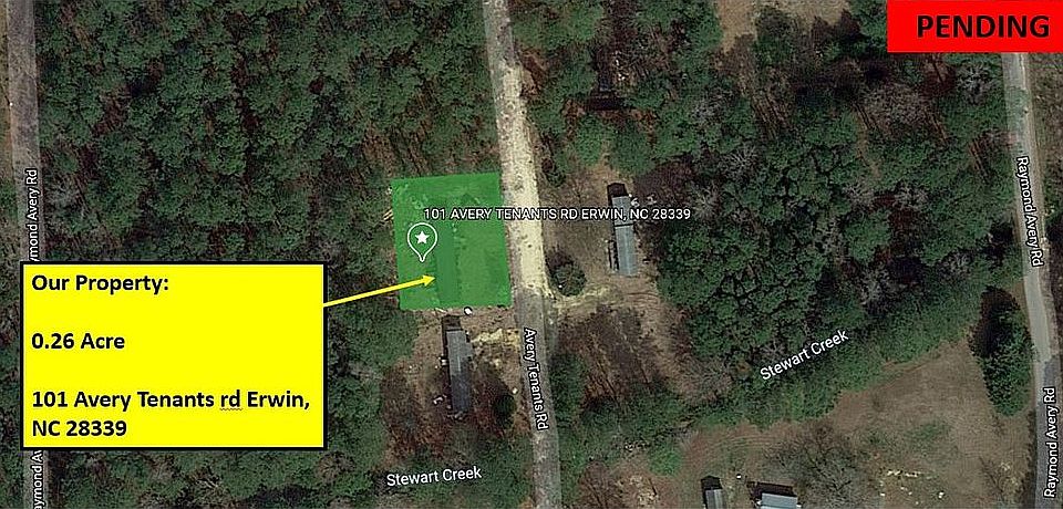 Here are the details: Property Address: 101 Avery Tenants Rd Erwin, NC 28339 Cash Sell Price: $9,999.00 ** Has a Well and Septic System ** ACREAGE: 0.26 Acres STATE: North Carolina COUNTY: Harnett County LATITUDE/LONGITUDE: 35.3467285235101,-78.6832860095368 Google Coordinates: bit.ly/101AveryNC ASSESSOR'S PARCEL NUMBER: 0598-41-5202.000 ANNUAL PROPERTY TAXES: $125.25 ZONING: RD Please confirm with the County Planning and Zoning Department at ((910) 897-5140) SETBACK REQUIREMENTS: 40'from the front,12'on each side and 40'from the rear TRAILER PERMITTED: YES (ONLY NEED PERMIT FOR SINGLE WIDE) RV PARKING PERMITTED: Yes TESTS AND SURVEYS: No Recent Soil Test or Perk Test has been conducted on this property. Any and all such tests will have to be done at Buyer's expense. ** Disclaimer ** FreedomHill Properties LLC is the contract holder and not the owner on record. FreedomHill Properties LLC has a valid Purchase Agreement for this property with the owner. FreedomHill Properties LLC will close on this property and resell it to a suitable and qualified buyer.