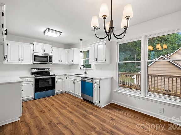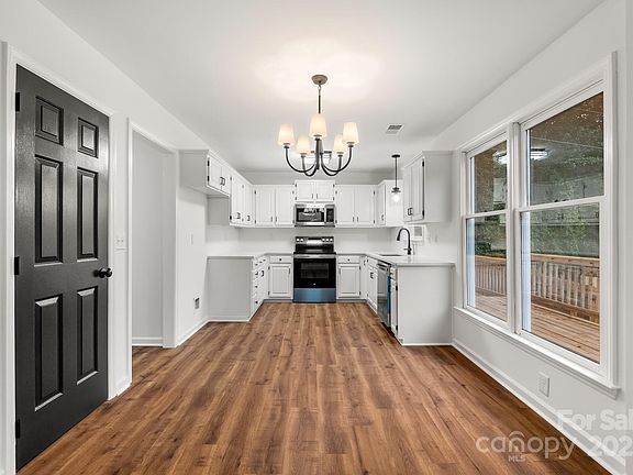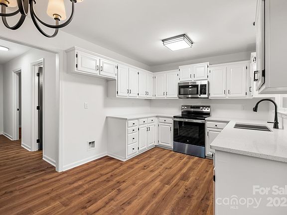 Welcome to this beautifully updated 3-bedroom, 2-bath home, perfectly situated on a private, fenced 0.25-acre corner lot in the desirable Wesley Woods community—with no HOA—and within the sought-after Fort Mill school district. Step inside to the open living room with vaulted ceiling and beautiful stairway with wrought iron details that is the feature of the living room along with the rustic fireplace.