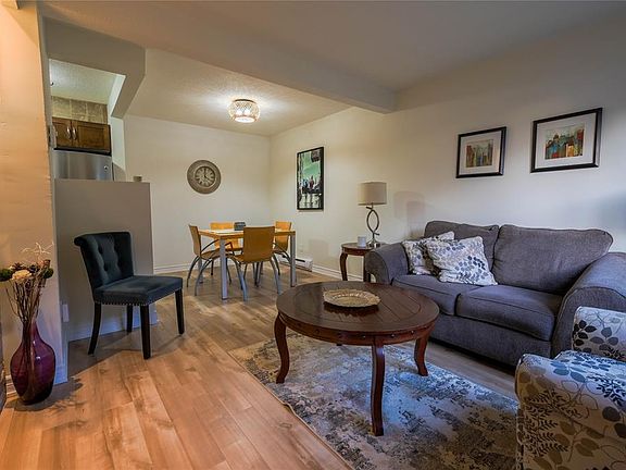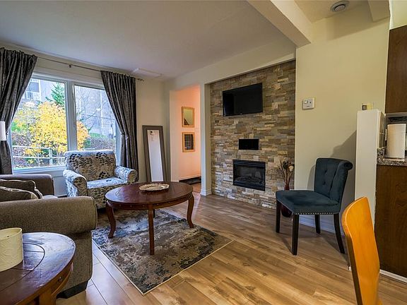 Beautifully updated two-storey condoStunning stone-accented fireplaceLovely galley kitchenStainless steel appliancesTasteful ceramic backsplashTwo comfortable bedroomsAmple closet space