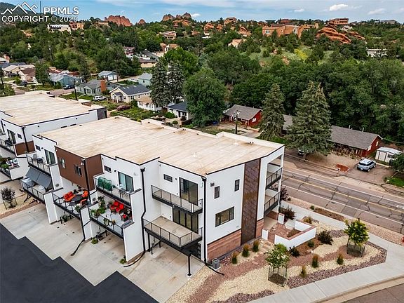 Elevated Luxury Living in Manitou Springs – Brand New Builder’s End Unit with Unmatched Upgrades. Introducing an extraordinary opportunity to own the premier residence in this sought-after Manitou Springs development—the builder’s own unit, completed in 2025 and showcasing a curated collection of luxury upgrades and high-end finishes throughout. Never lived in, and thoughtfully designed with both elegance and function in mind, this stunning end-unit townhouse offers unmatched comfort, style, and modern convenience. Step inside and take the private in-unit elevator to the heart of the home, where an open-concept great room impresses with expansive wormy maple hardwood floors, custom metalwork accents, and recessed LED lighting. The showstopping gourmet kitchen features an oversized waterfall island, an 8-burner chef-grade FORNO double oven range, stainless KitchenAid appliances including refrigerator and dishwasher, a large walk-in pantry, and sleek modern finishes. The kitchen flows seamlessly into a spacious living area, complete with a gas fireplace, built-in wood shelving, and panoramic Pikes Peak views framed by oversized windows and direct access to one of four private decks. Whether entertaining or relaxing, this space offers the perfect blend of warmth and sophistication. The luxurious primary suite includes a gas fireplace, dual walk-in closets, a private deck, and stunning mountain views. Its spa-inspired bathroom features a steam shower with waterfall and standard heads, heated tile floors and smart backlit mirror. Additional bedrooms offer en-suite baths with heated floors, jetted tub, and designer finishes—ideal for guests or home office use. This home also features a two-car garage, four private decks plus a side patio, and an end-unit location for maximum light and privacy. Just minutes from downtown Manitou Springs, Old Colorado City, Garden of the Gods, and Red Rock Canyon. Schedule your private tour today.