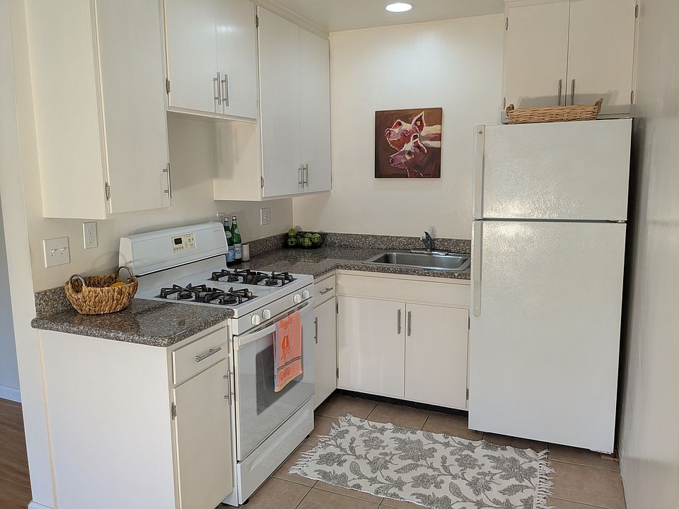 Open kitchen plan with adjacent dining and living room areas. Kitchen has granite counter-tops, gas range, fridge, and stainless steel sink. Vinyl plank flooring throughout the apartment with ceramic tile in the kitchen and in the bathroom. Bedroom has walk-in closet and linen closet. Bathroom has a shower over tub. Windows are double-pane. A sliding-glass door leads to a private balcony. Coin operated laundry room is on site. One assigned carport is included, and there is also street parking nearby. Dedicated on-site manager.