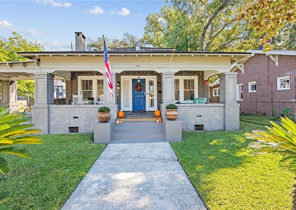 Welcome  to this charming 3-bedroom, 2-bath cottage nestled in the heart of Midtown Mobile, at 101 Bradford Ave. Built in 1928 and offering 1806+/- square feet of living space, this home blends historic character with modern comforts. Step inside to find beautiful, original built-ins flanking a cozy fireplace, gorgeous rich hardwood floors and 9-foot ceilings that enhance the open, airy feel. The formal dining room invites gatherings, while the office with French doors provides a versatile space. There are 2 bedrooms and 2 bathrooms downstairs and a large bedroom upstairs. The kitchen and bathrooms have been renovated and the entire interior has been freshly painted with a designer white and updated with  new light fixtures. Outside you'll find a large corner lot offering a sprawling 30-foot front porch, ideal for relaxing or entertaining. The lush landscaped backyard with a built-in firepit and privacy fence, create an intimate and inviting outdoor entertainment area. This home is filled with light and all the rooms are very spacious. All updates per the seller. Listing company makes no representation as to accuracy of square footage; buyer to verify.  Make your appointment today! Best offers will be entertained---bring us yours!