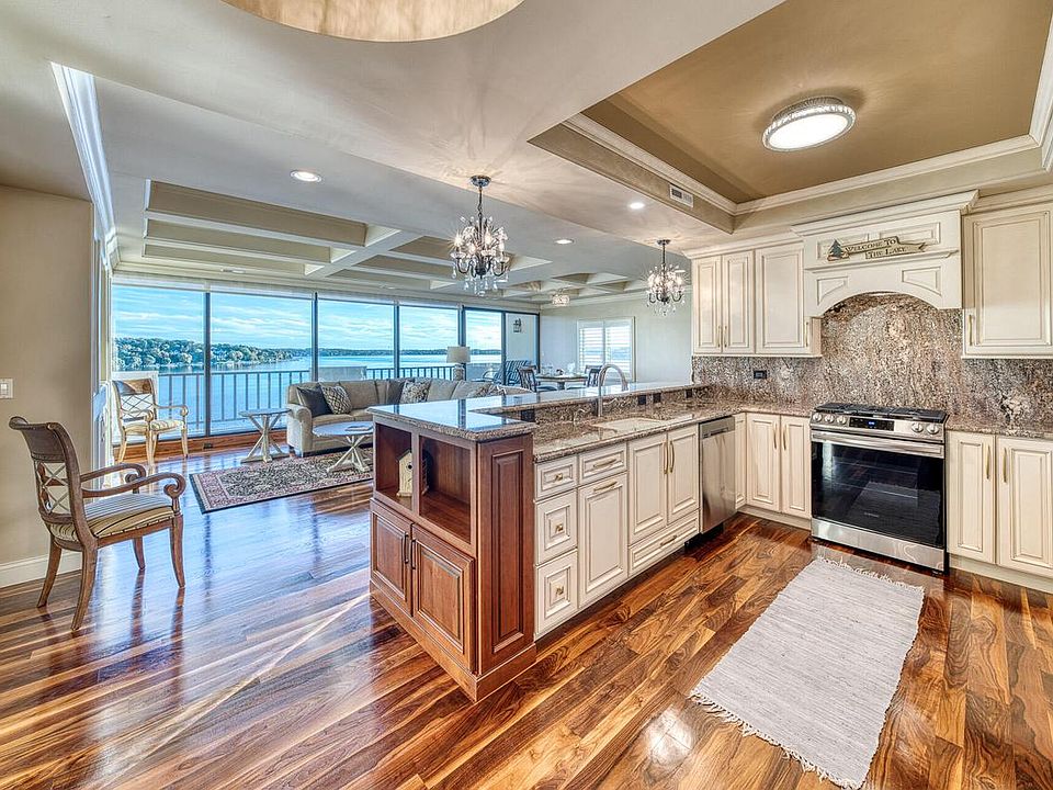 Walk-in closetOpen concept floor planPanoramic lake viewsSpacious kitchenCoffered ceilingsFloor to ceiling windowsCrown molding