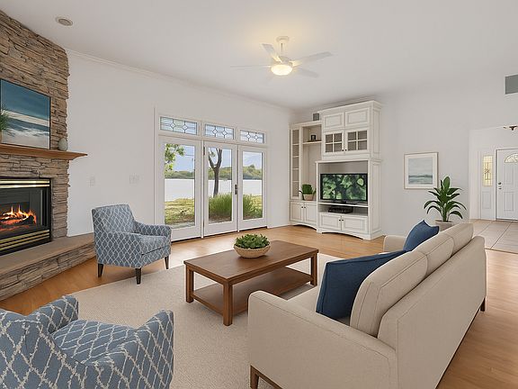 Flagstone fireplaceLarge loftTall ceilingsPrivate pierSpacious bedroomsBreathtaking sunset viewsMaster suite