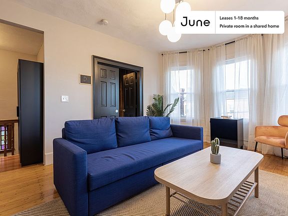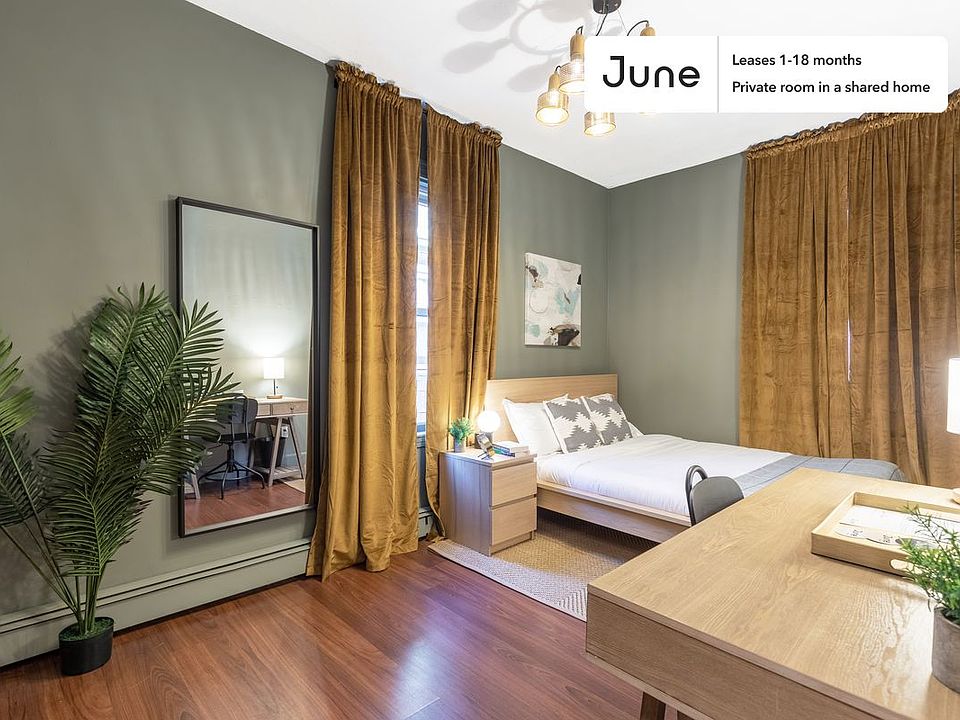 This Queen room in Mission Hill is available on a 12 month lease or a flexible short term (31 to 364 days) lease. You pick your custom start and end date. Monthly rent rate is determined by furnishing preference, move-in date and move-out date. Speak to a June representative for recommendations on the best stay duration for the lowest rate.