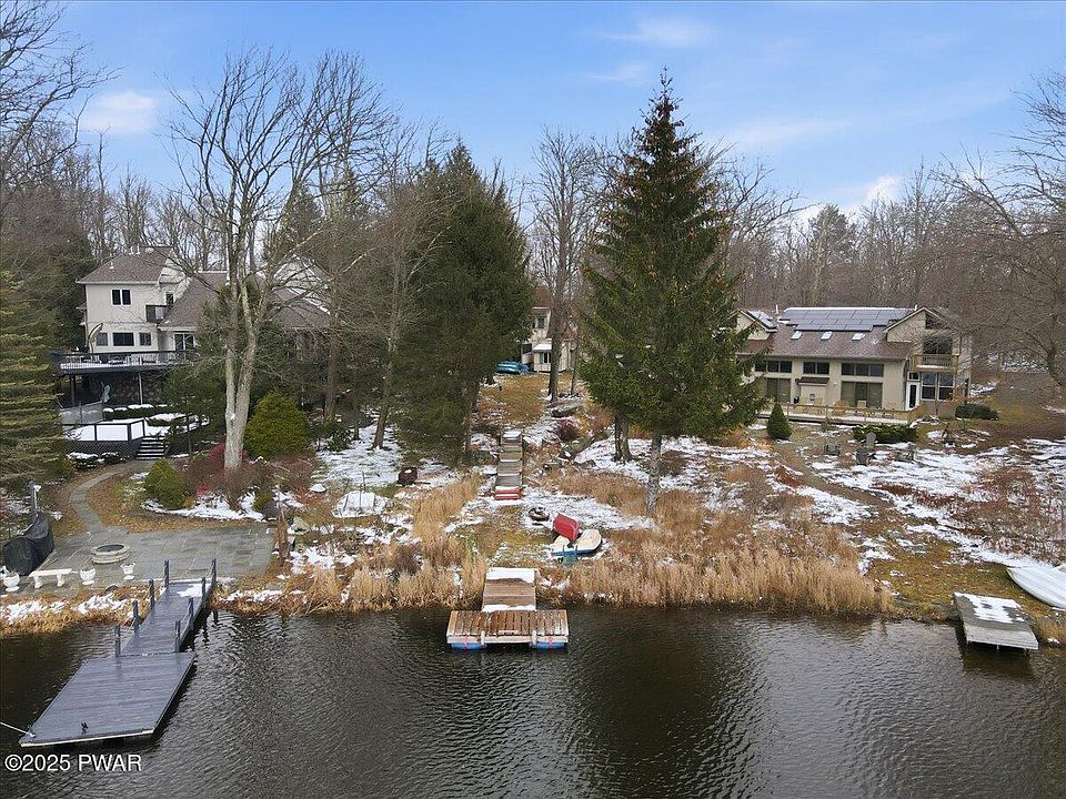 Welcome to your Pocono Mountains lakefront retreat. This whimsical stone Tudor home in Lake in the Clouds blends charm with comfort. The cozy open layout brings the kitchen, dining, and living room areas together.The kitchen features sleek stainless steel appliances and a propane stove. The living room feels warm and inviting with a fireplace and wood stove. The first floor includes a bedroom, a full bath, and laundry. Throughout the home you will find classic wood doors, including French wood doors in the first bedroom, the living room, and the dining room. Upstairs, the large primary bedroom provides a peaceful retreat. The third bedroom includes a side loft area that can serve as an office, gym, or extra sleeping space.Relax on the spacious enclosed porch and enjoy tranquil lake views. The home also includes a carport, storage, and a workshop. Flooring includes laminate wood, slate, vinyl wood, porcelain tile, and carpeting. The sellers are leaving extra laminate wood so the kitchen and dining room can be updated to match the living room.Residents enjoy three lakes for swimming, boating, and fishing. The community also offers a clubhouse, pavilion, tennis and shuffleboard courts, basketball courts, a playground, and walking trails. Visit www.lakeintheclouds.org for HOA community information.HOA amenities include the clubhouse, playground, basketball court, shuffleboard court, beach, fishing, boating, and road maintenance. Most furniture and the paddle boat are included. Please ask me for the full furniture list attached to this listing.Do not miss this exceptional lakefront retreat in the Poconos. It is perfect for full-time living or weekend getaways.