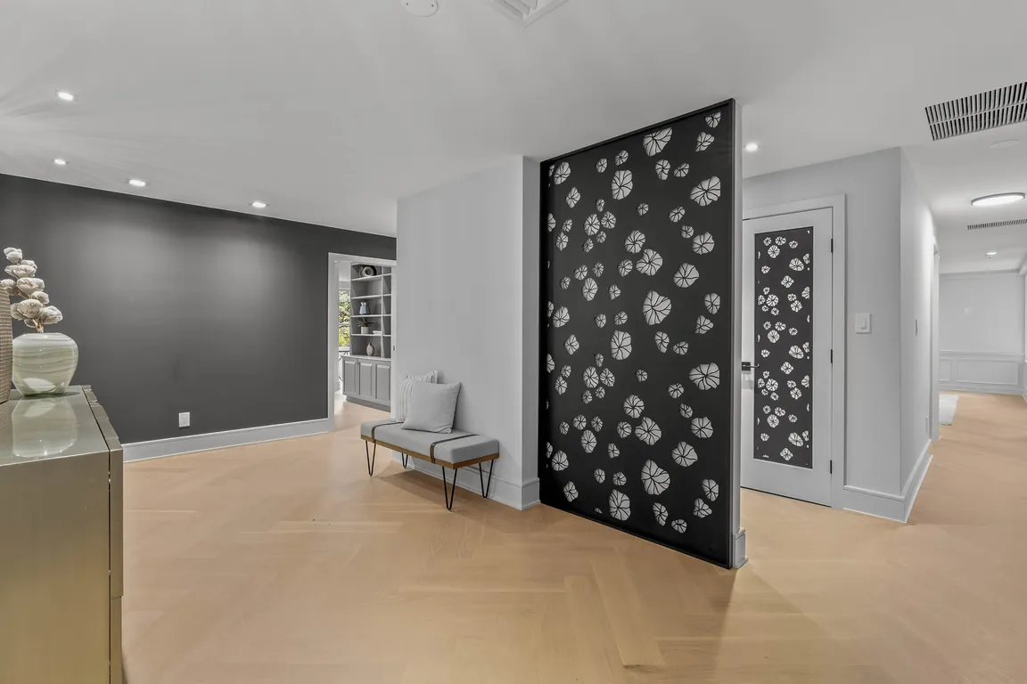Fireplace mantelQuartz countersRainfall showerDining roomBacklit wall screensPrimary suiteOffice with built-ins