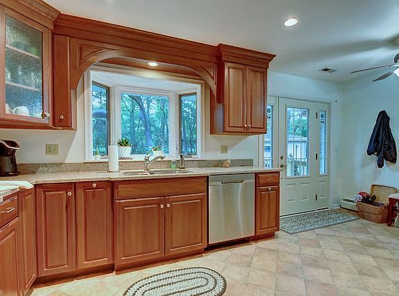 This home stands perched atop a gently sloping hill and beneath the tall oaks sits this super roomy all brick ranch. Garage space for 5 cars (2 attached/3 detached) makes this home perfect for the contractor or auto enthusiast. A circular driveway leads to the one acre homesite with an additional, wooded acre lot adjacent. Inside, a nicely updated kitchen awaits, featuring newer SS appliances (including double oven), granite counters and an abundance of high quality cabinetry. Three nice sized bedrooms share an updated hall bath. The living room picture window overlooks the huge, sloping front yard. Downstairs, the lookout basement is a great, entertainment space/family room including a fireplace and wet bar. Lots of storage, too. Tower is removeable, but would be ideal for an amateur (HAM) radio hobbyist.