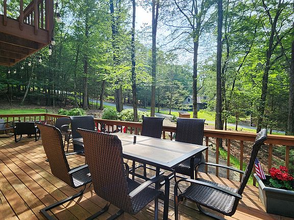 Turn-key gem in the desirable Tanglwood Lakes community with access to stunning Lake Wallenpaupack! This beautifully maintained home features 3 spacious bedrooms, 2 fully updated bathrooms, and a completely remodeled kitchen with modern finishes. Enjoy the warmth of natural hardwood floors throughout and cozy up by the wood-burning fireplace on chilly nights. The expansive wrap-around deck is perfect for entertaining or relaxing in the peaceful surroundings. Additional features include a 1-car garage and a full basement offering ample storage or potential for additional living space. Don't miss this move-in-ready home in one of the area's most sought-after communities!