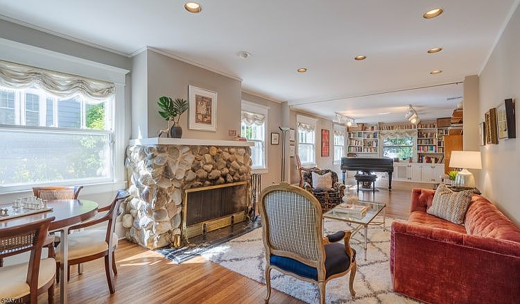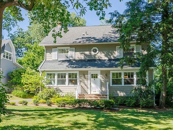 Located on one of towns most desirable streets, this understated and gracious home is ideal. From the enclosed front porch and beyond, light streams thru the oversized windows of each comfortable room of this lovingly maintained center hall w beautiful period details, high ceilings and easy flow. Deep center foyer opens to the spacious Living Rm w stone WBFP transitioning to Family Rm w custom book shelves, creating one amazing space. Formal Dining Rm leads to retro EIK w back staircase and inner hallway to Mud Rm, Laundry, PR and easy access to rear deck overlooking private, fenced yard. Upstairs to Primary en-suite w Full bath, 3 more good sized BR's and Hall bath. Open staircase to wide 3rd Fl w 2 BR's and Full bath. Unfinished basement w plenty of storage space; CAC; 2-car garage. 1 2 mile to NYC Train and Town.