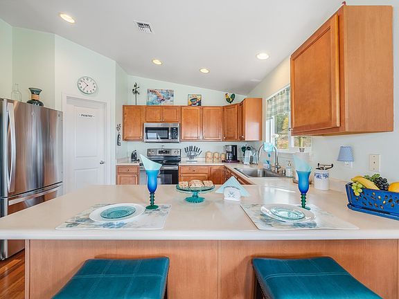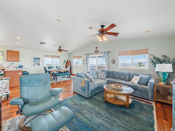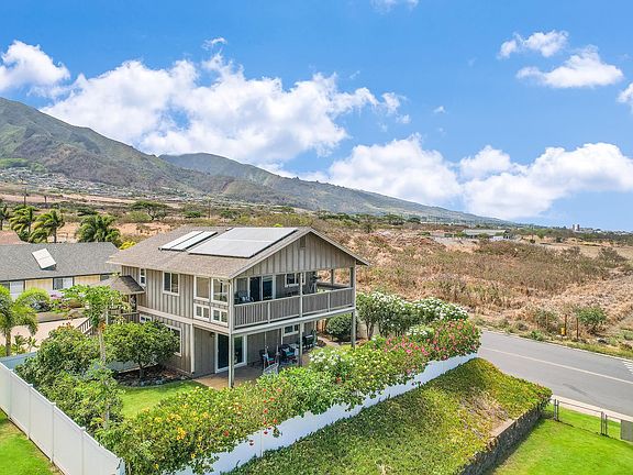 A relaxed welcome feeling with pride of ownership is conveyed in this desired ocean and Haleakala views Waikapu Gardens residence. Spacious open kitchen with stainless steel appliances, a sizeable pantry closet and a large countertop/bar that feeds into the dining area with hardwood flooring. The master bath has been remodeled with a walk-in shower, ceramic tiles, bamboo cabinets, Tiling double sink vanity with granite countertops. The downstairs bath has been recently updated with ceramic flooring and quartz countertops. An owned photo-voltaic system, solar water heating and tinted windows help reduce energy cost. Central AC cools the upstairs with 3 split Fujitsu units to cool the downstairs and all units have been recently serviced. De-stress in comfort with a beverage of your choice or entertain your special guest on the downstairs garden view lanai or upstairs ocean and Haleakala views both covered with 280 spacious sq ft. A mature landscaped yard which includes numerous varieties of flowers with avocado, lemon/lime, banana and papaya fruit trees. An additional storage shed has been built for gardening tools and or anything that needs to be stored out of the elements. A two-car garage and outside driveway allows extra room for parking additional vehicles. There are walking trails and a community park for exercise. Waikapu Gardens is located close to schools, shopping, dining and the Kahului airport. Home is to be sold partially furnished which includes a large wall mounted smart flat screen TV in the living room.