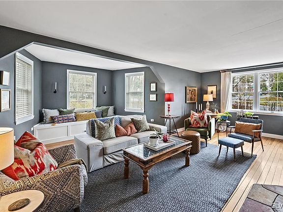 - Description: Features include hardwood flooring, a full-height stone fireplace with mantle, large sun-filled windows, built-in shelving, and a custom window seat. Open-concept layout connects seamlessly to kitchen and dining areas.