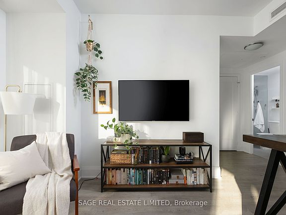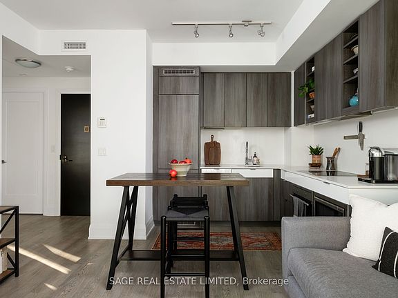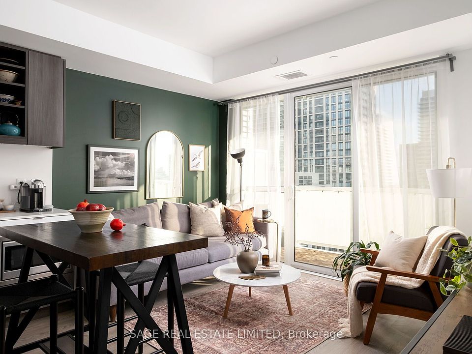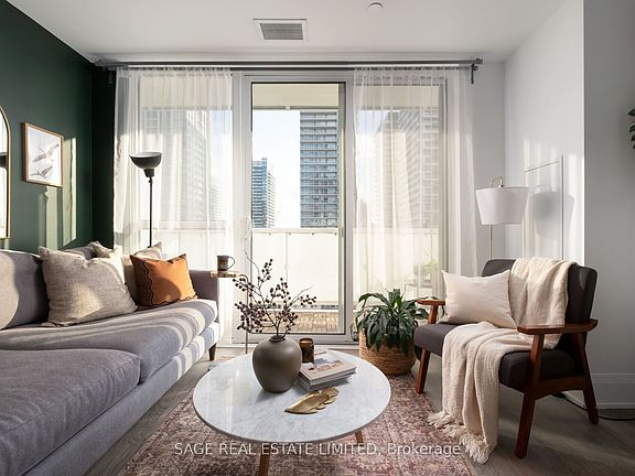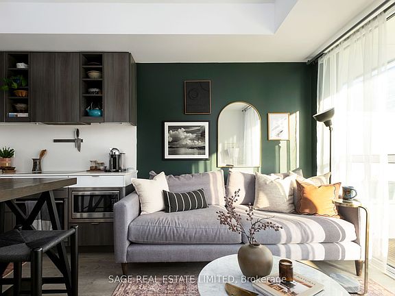 You feel the warmth before you even find the light switch. The space seems to recognize you, offering a soft welcome that settles in your chest. High above the city, where light moves across glass towers like a slow-turning spotlight, this residence unfolds like a private gallery. Not loud. Not rushed. A statement without trying. Rich pigment and warm light ground the residence in quiet luxury. The deep green accent wall sets the tone, creating a calm, cinematic mood that carries throughout. Full-height cabinetry, integrated appliances & clean architectural lines define a home that feels chosen and confident. An excellent floor plan creates an obvious spot for a table, giving an easy flow for cooking, hosting and working. Soft southern light drifts through the sheer curtains from morning to evening. Plants thrive. A gallery-like stillness settles over the living area, the kind that takes your breath for a moment and makes the pulse of the city feel distant even when it is right at your doorstep. The bedroom continues this sense of ease with neutral walls, a physical door & a large window. Simple. Serene. A true retreat. The balcony adds its own quiet magic. Warm daylight from early until late. Morning coffee. Afternoon sun. A personal outdoor corner suspended above the neighbourhood. Deeply livable and quietly luxurious, this residence is for someone who wants their home to feel as curated and intentional as the life they are building. Built by Tridel, one of the most respected developers in the country, the building offers thoughtful refinement with a concierge and lobby that feel more boutique hotel than condo, along with a movie theatre, fitness centre and outdoor pool. Just off Yonge yet removed from its rush, you are steps from cafés, boutique shops, restaurants, daily essentials, parks, the Eglinton subway station and the future Crosstown LRT, creating a neighbourhood that is both connected and effortlessly calm.