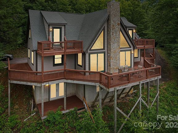 Gorgeous contemporary home just above Maggie Valley at 4200 ft elevation! The home is private with incredible year-round views! With decks on both levels & balconies off the 2nd level rooms, there is plenty of space to enjoy the absolutely stunning views! With paved access and just over 5 minutes to Maggie Valley the home features an open living area with tongue & groove ceilings & exposed beams, wood floors (tile in baths), a spacious kitchen with plenty of windows to take in the views, primary bed/bath & the laundry on main, & large dining room! The upper level has a nice loft space that offers some of the best views in the home, a 2nd bedroom, & a bonus room. The basement is finished with a full bath & a large bonus room. The home is custom built & has poured concrete walls, a beautiful stone chimney/fireplace, & the drive is gated for added security. A spacious 2-car garage allows space for a workshop. The sellers are open to offering some of the furnishings. Fresh exterior paint!