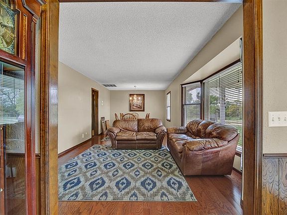 Beautiful home on six acres a must see! This home has two distinct spaces for entertaining or just spending time with family . Upstairs offers 3 large beds with large closets and bath with double vanities 3rd bed upstairs could b great for theatre room .For added peace of mind a storm shelter located in oversized garage Don't miss the opportunity to see this one . 5th bed with option to be an office with built-in ,2.5 bath , 2 living spaces , hardwood floors and so much more